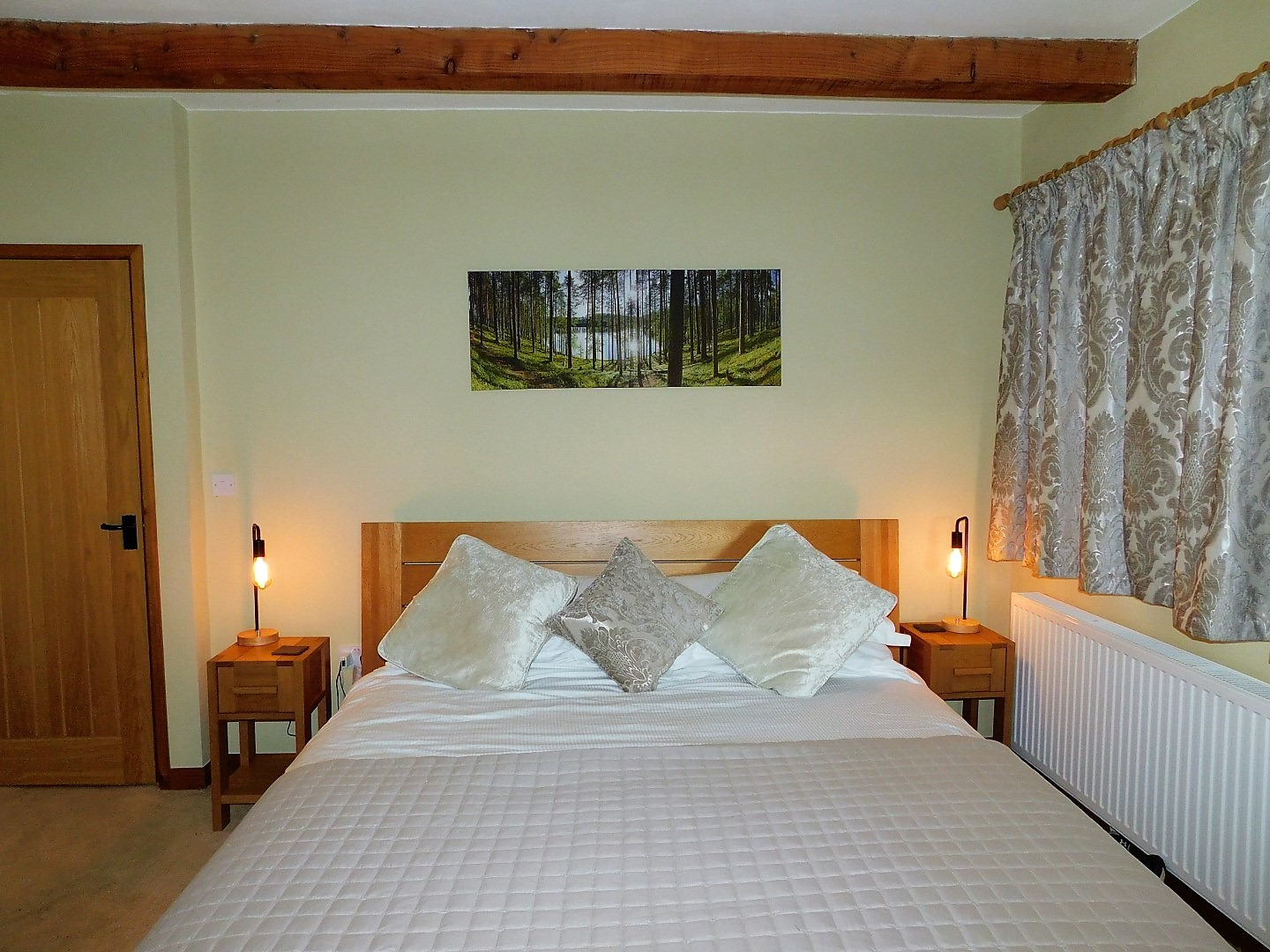 Wooden king size bed, bedside tables, chest of drawers, wardrobe, Smart TV and hairdryer.